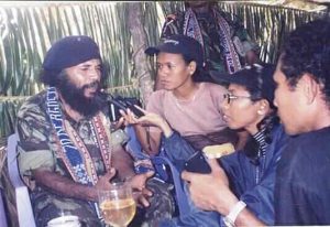 “Ha’u entrevista Xanana Gusmão iha Komarka, Cipinang, Jakarta, Indonézia (data ha’u haluha). Hafoin rezultadu entrevista ne’e publika iha Suara Timor Timur (STT), ha’u hetan ameasa husi ema pro-autonomia sira dehan ho liafuan hodi tolok Xanana katak, ‘ternyata badannya di Kota, otaknya GPK (Gerakan Pengacau Keamanan)’—‘afinál ninia isin-lolon iha vila laran maibé ninia kakutak ne’e kakutak GPK’,” nia fó hanoin hikas.