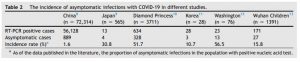 Zhiro Gao et al. iha sira nia “systemic review” ba artigu sira ne’ebé ko’alia kona-ba pasiente infetadu ho SARS-CoV-2 maibé assintomátiku hatudu kazu assintomátiku existe iha diferente nasaun no nia pursentajen varia hosi nasaun ida ba nasaun seluk. (Tabela 1)