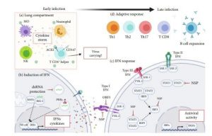 Hafoin ema ida infetadu ho vius corona, e kutun ne tama ba organizmu liu hosi via respiratoria, inmediatamente rekoñese kedas hosi “Pattern Recognition Receptors” hanaran Toll like reseptór (TLR 7 e TLR 8) ne’ebé esprezadu ka hela iha selula epiteliales hotu no mos iha selula sistema immune innato nian hanesan macrofagor alveolar.15 Depois hasoru malu ka kontaktu entre komponente rua iha leten, Pattern Recognition Reseptór ka Toll like reseptór rekruta ka ativa proteina adaptadór sira hanesan fatór reguladór interferon (IRF), NF-kB, AP-I ho objetivo prodús proteina antivirais dahuluk hanesan Interferon tipo –I e III ho kemosina oin oin.16 Kemosina sira ne’e hahú halo nia papel hodi atrae ka alerta tutan ba selula seluk ne’ebé pertense ba sistema immune innato hanesan polimorfonuclear neutrofilos, monocitos, selula naturál killer ka NK, selula dendrita (DC) ka populartmente hanaran selula presentadora de antijenu atu organiza an hasoru invasór foun ne’ebé maka tama ba iha sira nia área, iha kazu ida ne’e virus corona. Iha tempu hanesan selula dendrita hamutuk ho selula sira seluk iha sistema immune innato prodús mos kemosina sira seluk hanesan MIG, IP10 ho MCP-1, ne’ebé iha kapasidade rekruta ka alerta tutan ba limfocitos sira iha sistema immune adaptativa nia laran atu prepara an hodi identifika antigen virál hosi virus corona ne’ebé sei aprezenta hosi selula dendrita.17,18 To iha segmentu ida ne’e ita bele hatene uitoan ona prosesu luta sistema immune innato hodi defende ita hosi agresaun esterna kordenasaun servisu entre sira.