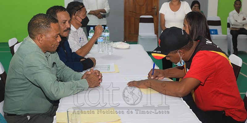 Traballadór timor-oan, Francisco da Costa Pereira, asina deklarasaun aseitasaun ho Sekretáriu Estadu Formasaun Profisionál no Empregu, Alarico do Rosário no Diretór Nasionál Empregu Exteriór SEFOPE, Filomeno Soares, hodi bá serbisu iha Koreia Sul, iha salaun Timor Lodge, Comoro, kinta (12/01). Imajen Tatoli/Francisco Sony