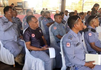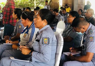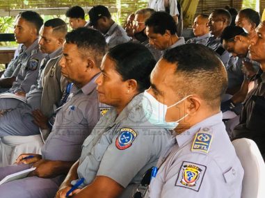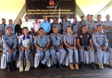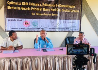 Diretór Yayasan Hak, Feliciano da Costa Araújo iha workshop kona-ba ‘Optimaliza kbiit lideransa, psikososiál no komunikasaun efetivu ba guarda-prizionál haree husi ókulu direitu umanu’, hamutuk ho guarda-prizionál Gleno no Becora. Workshop ne’e hala’o iha JL Vila, sesta (14/4/2023). Imajen Tatoli/António Gonçalves