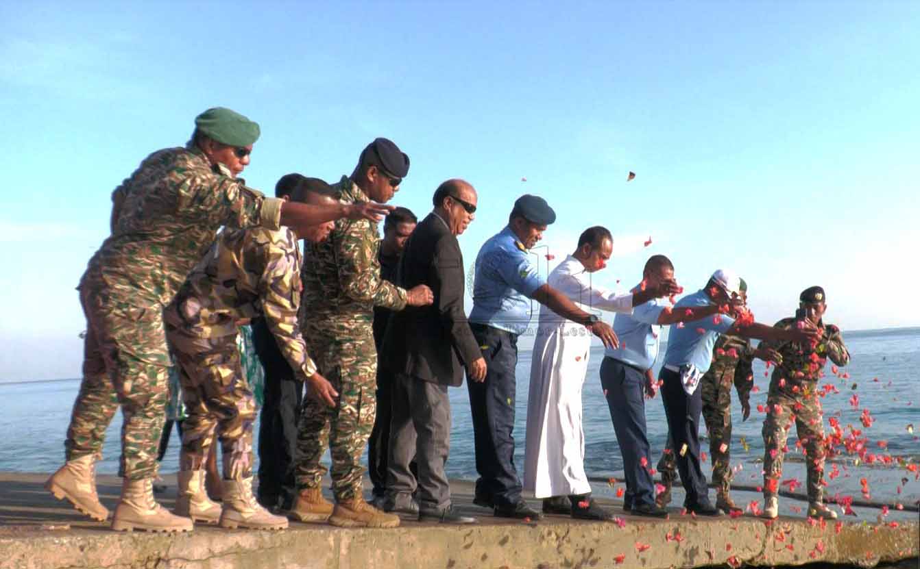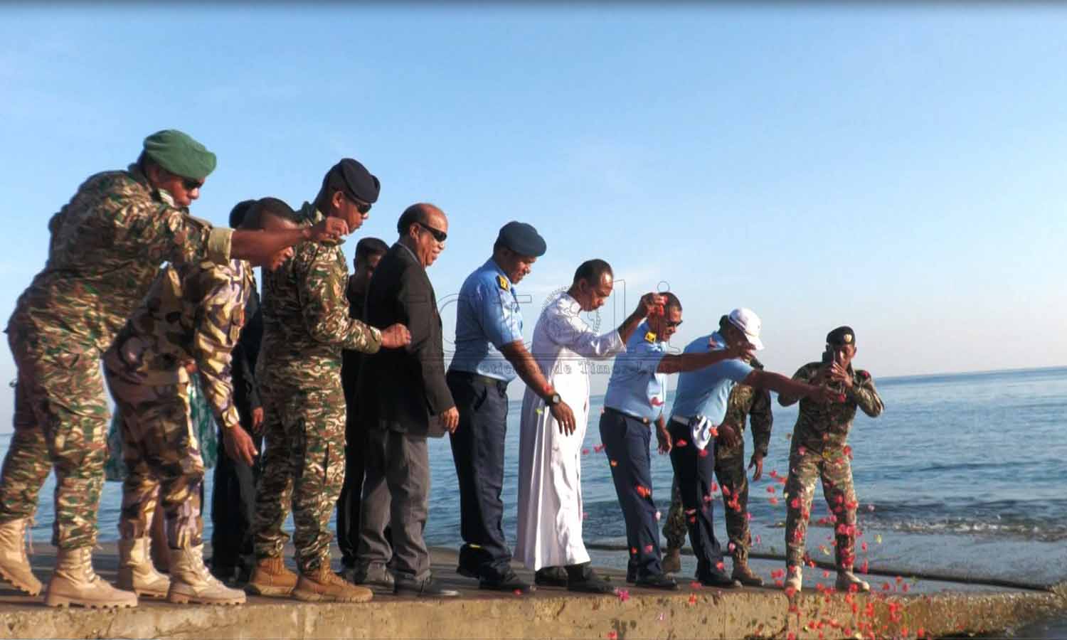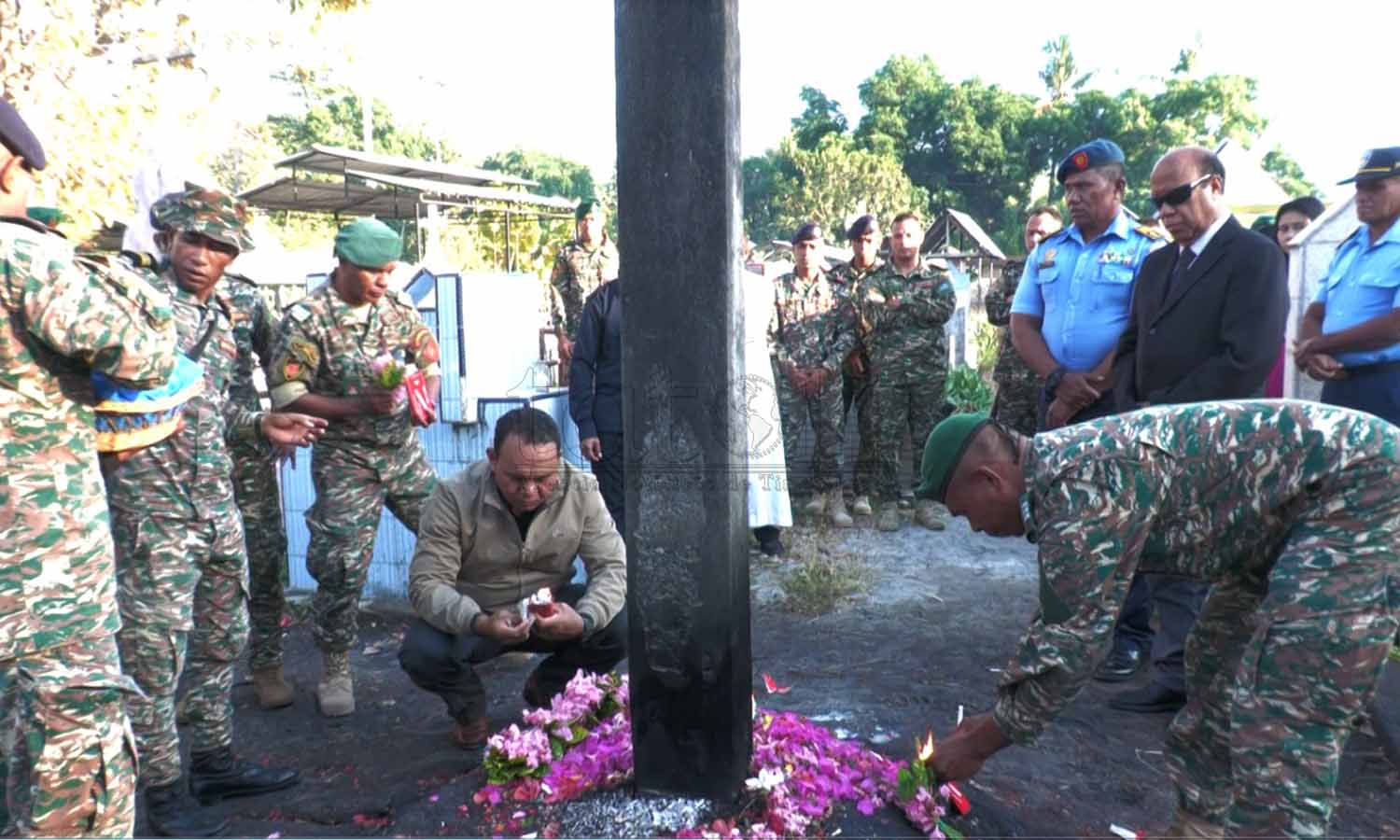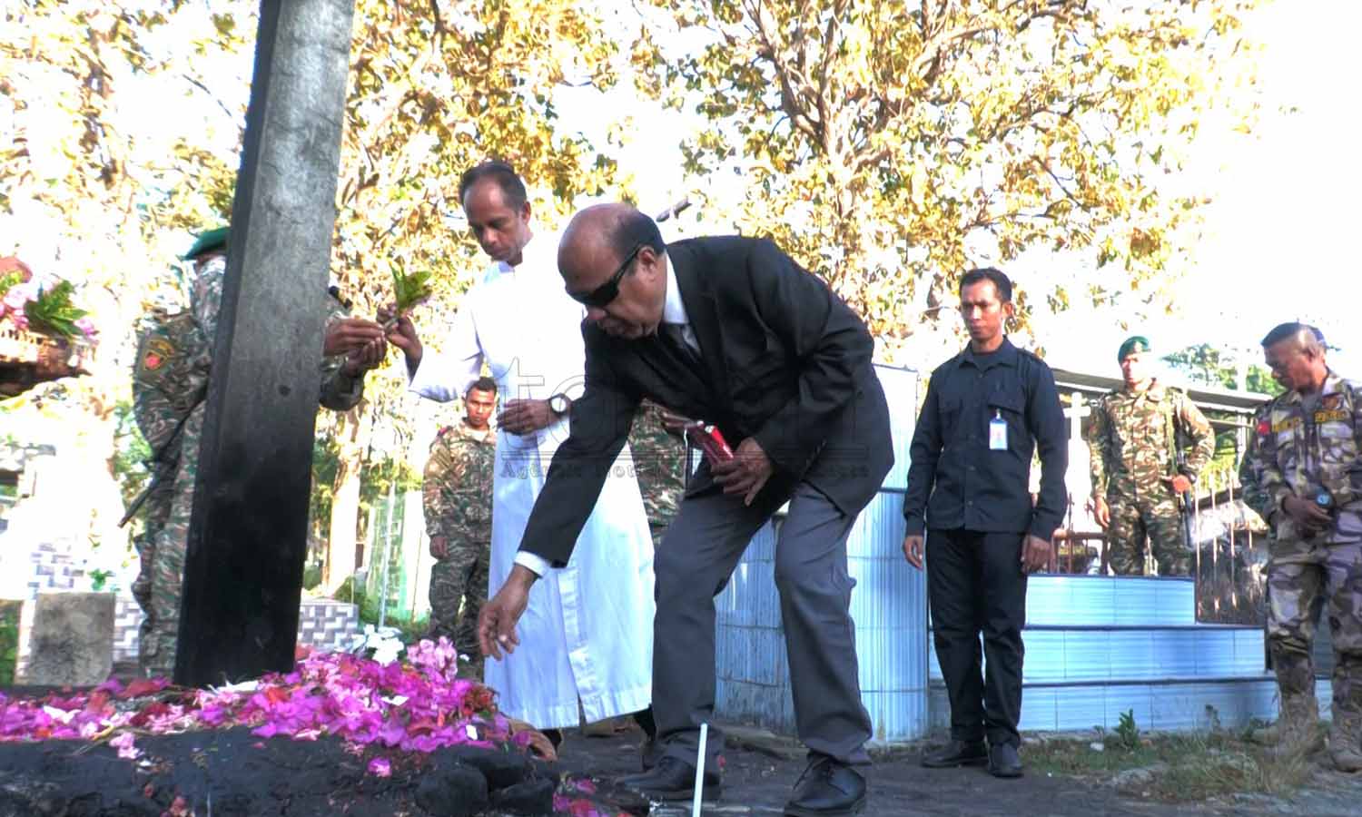 Prezidente Autoridade Rejiaun Administrativa Espesiál Oé-Cusse Ambeno (RAEOA), Rogério Tiago de Fátima Lobato, hamutuk ho FAFINTIL-Forsa Defeza Timor-Leste (F-FDTL) no Polísia Nasionál Timor-Leste (PNTL), selebra loron FALINTIL 20 agostu ba dala-49 liuhusi misa no sunu-lilin iha semitériu santa-krus no kari ai-funan iha tasi-ibun hodi onra ba martír libertasaun nasionál. Imajen Tatoli/Abílio Elo Nini