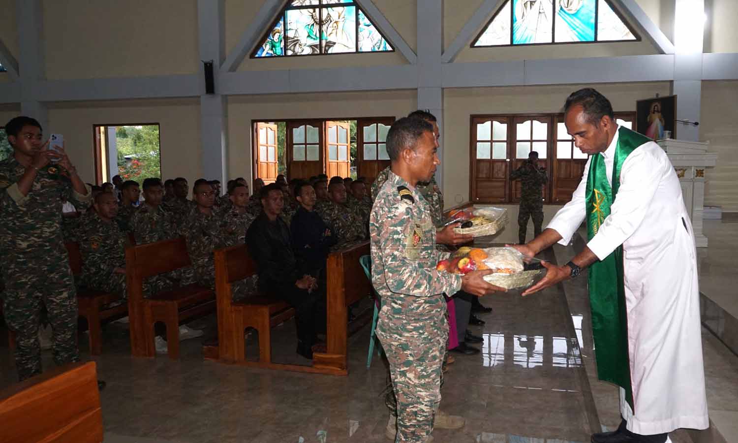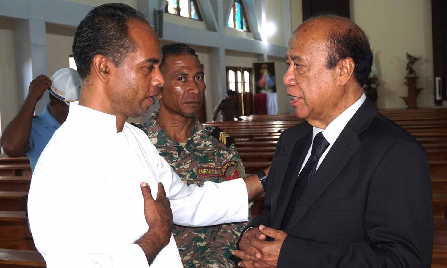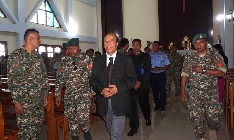 Prezidente Autoridade Rejiaun Administrativa Espesiál Oé-Cusse Ambeno (RAEOA), Rogério Tiago de Fátima Lobato, hamutuk ho FAFINTIL-Forsa Defeza Timor-Leste (F-FDTL) no Polísia Nasionál Timor-Leste (PNTL), selebra loron FALINTIL 20 Agostu ba da-49 liuhusi misa no sunu-lilin iha semitériu santa-krus no kari ai-funan iha tasi-ibun hodi onra ba martír libertasaun nasionál. Imajen Tatoli/Abílio Elo Nini