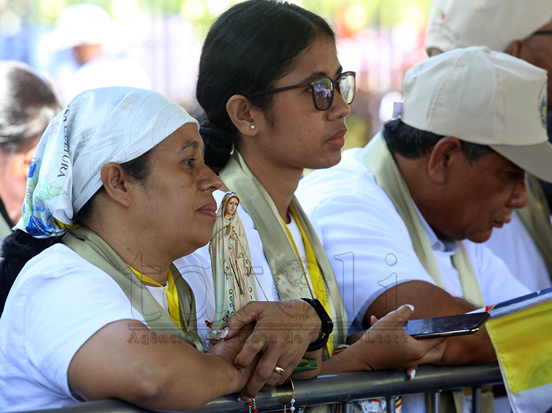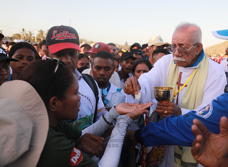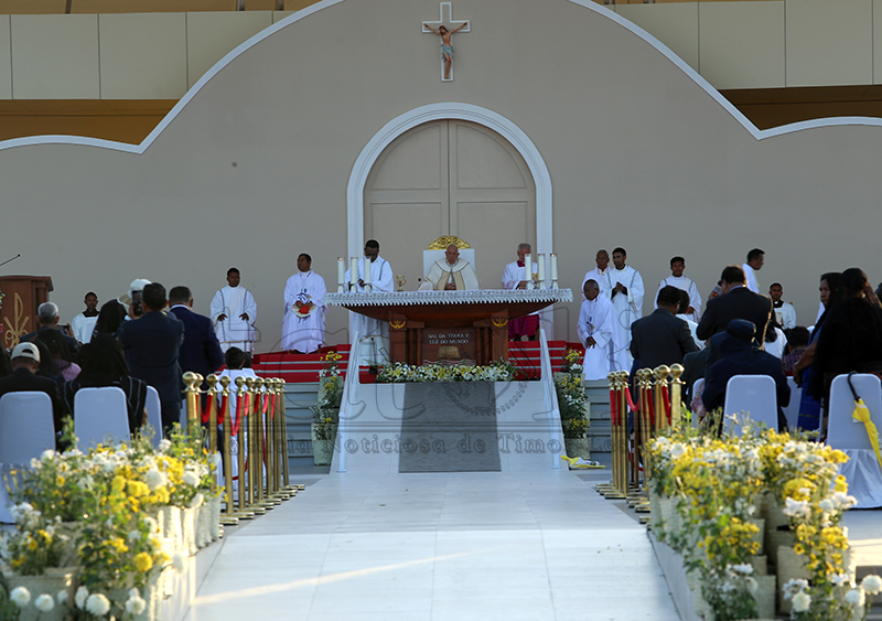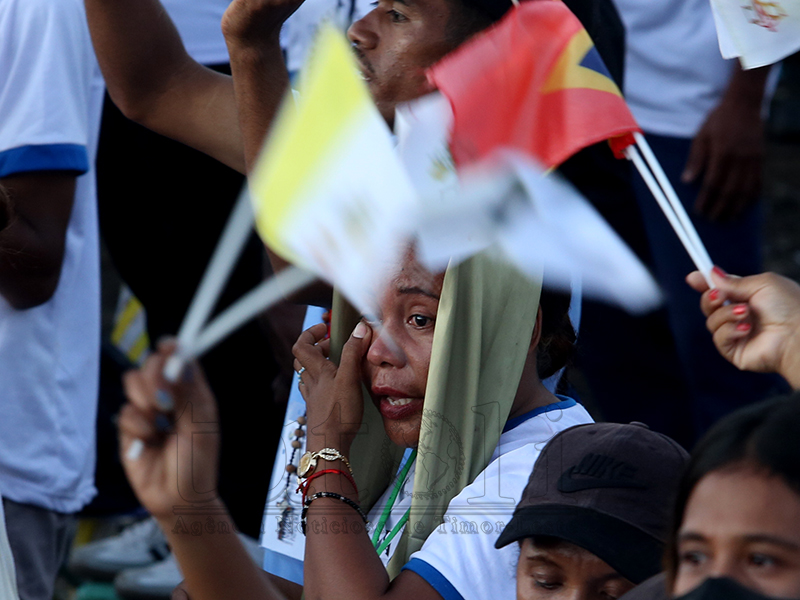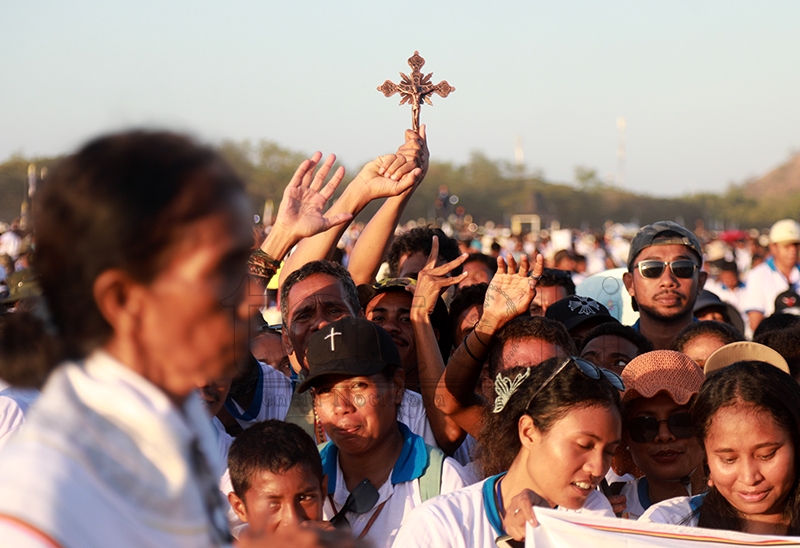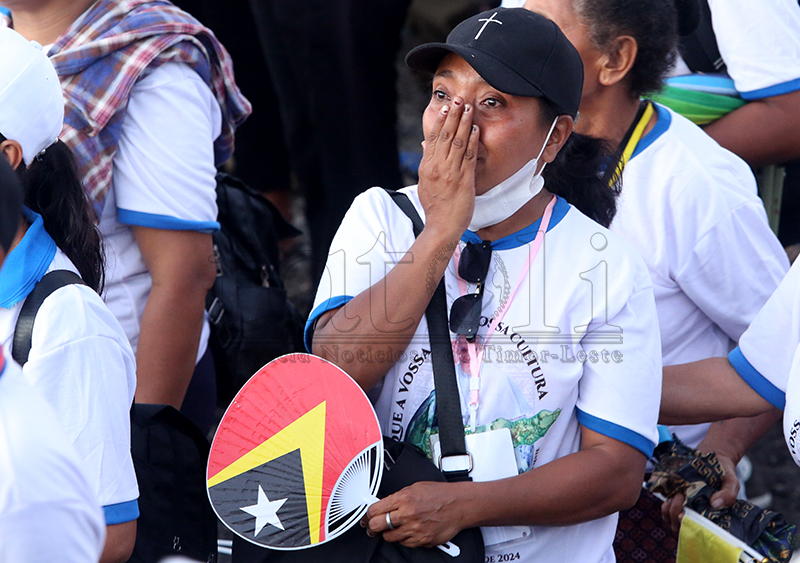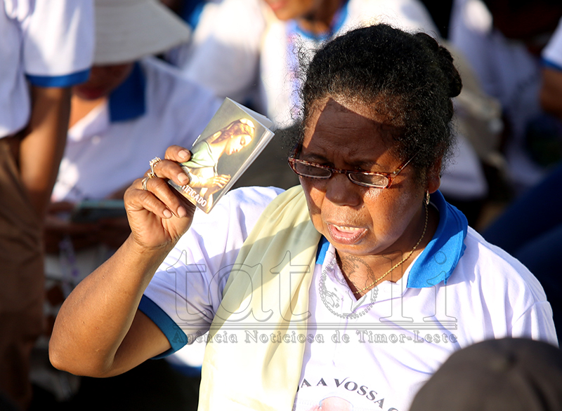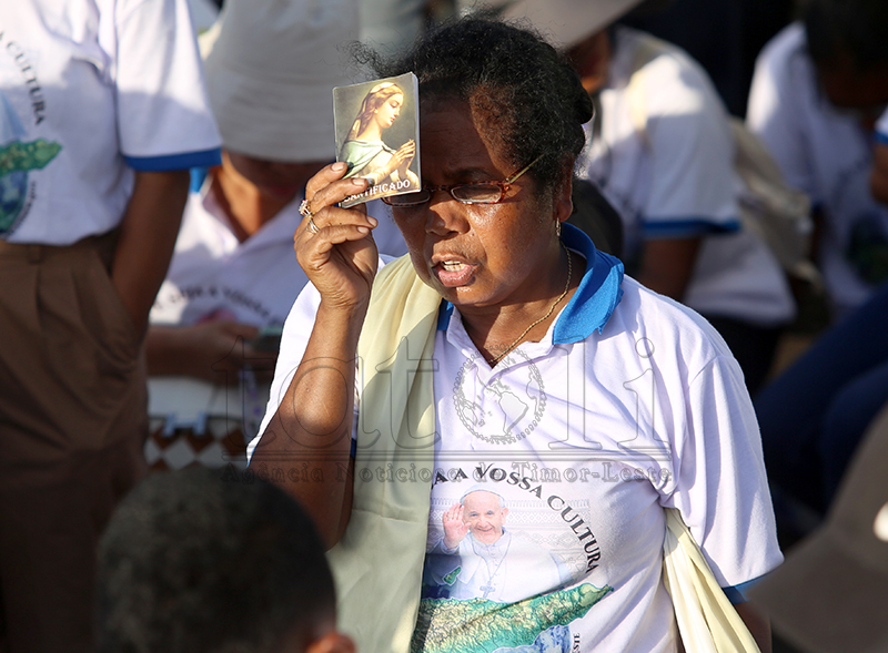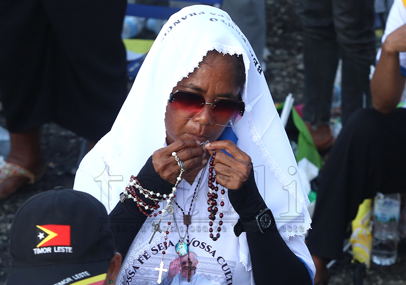Fé no devosaun ne’ebé timoroan sira iha ba fiar Katólika. Iha vizita Sua Santidade nian, sarani sira kaer no lori Relikia hodi hatudu sira-nia vertude nu’udar fiar-na’in maske loron manas, distánsia no kolen, hodi ba partisipa misa solene ne’ebé preside direta husi Amu Papa, nu’udar saseluk Kristu nian iha mundu. Imajen TATOLI/Francisco Sony