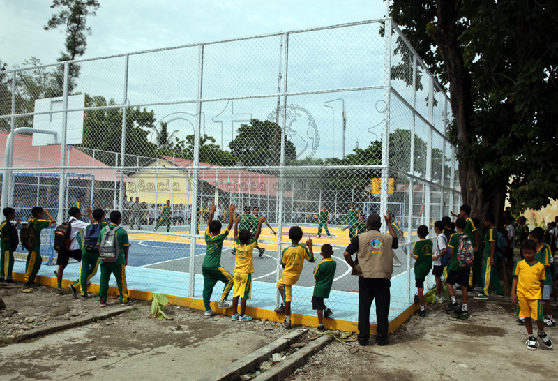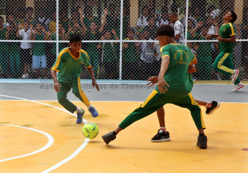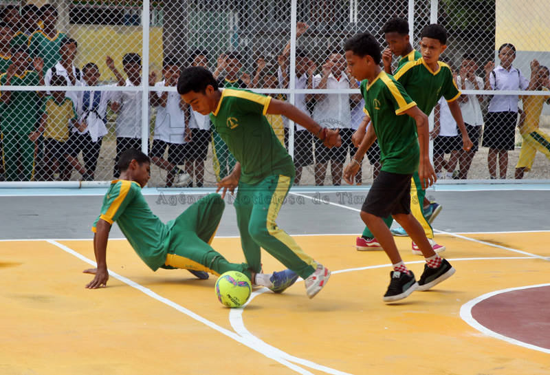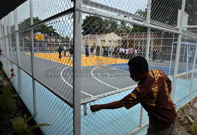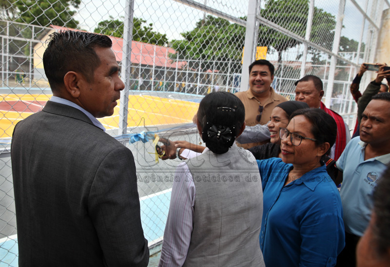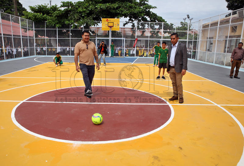 Estudante EBC Farol hahú tebe bola hafoin Sekretáriu Estadu Ensinu Sekundáriu Jerál no Ensinu Sekundáriu Tékniku Vokasionál, Domingos Lopes ho Prezidente kompania ETO, Nilton Gusmão dos Santos inaugura kampu Multifunsaun iha eskola EBC Farol. Kampu Multifunsaun ne´e halo husi kompania ETO, Dili, sesta (17 janeiru 2025). ImajenTatoli/ Antonio Daciparu