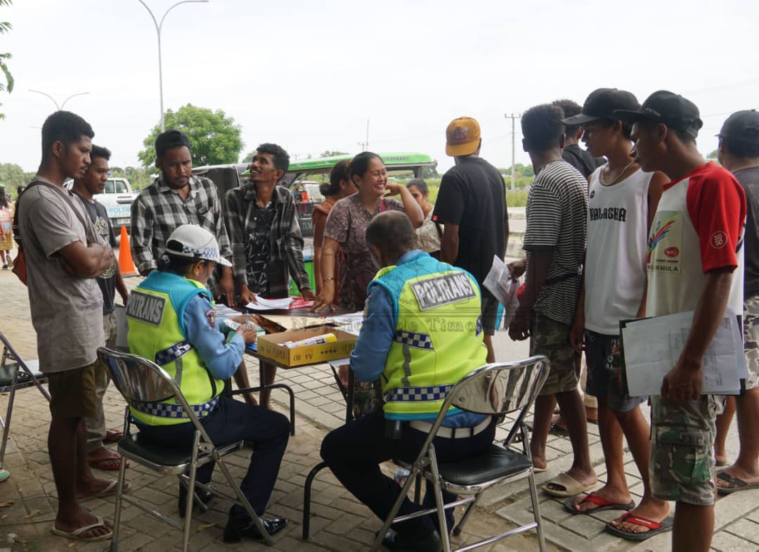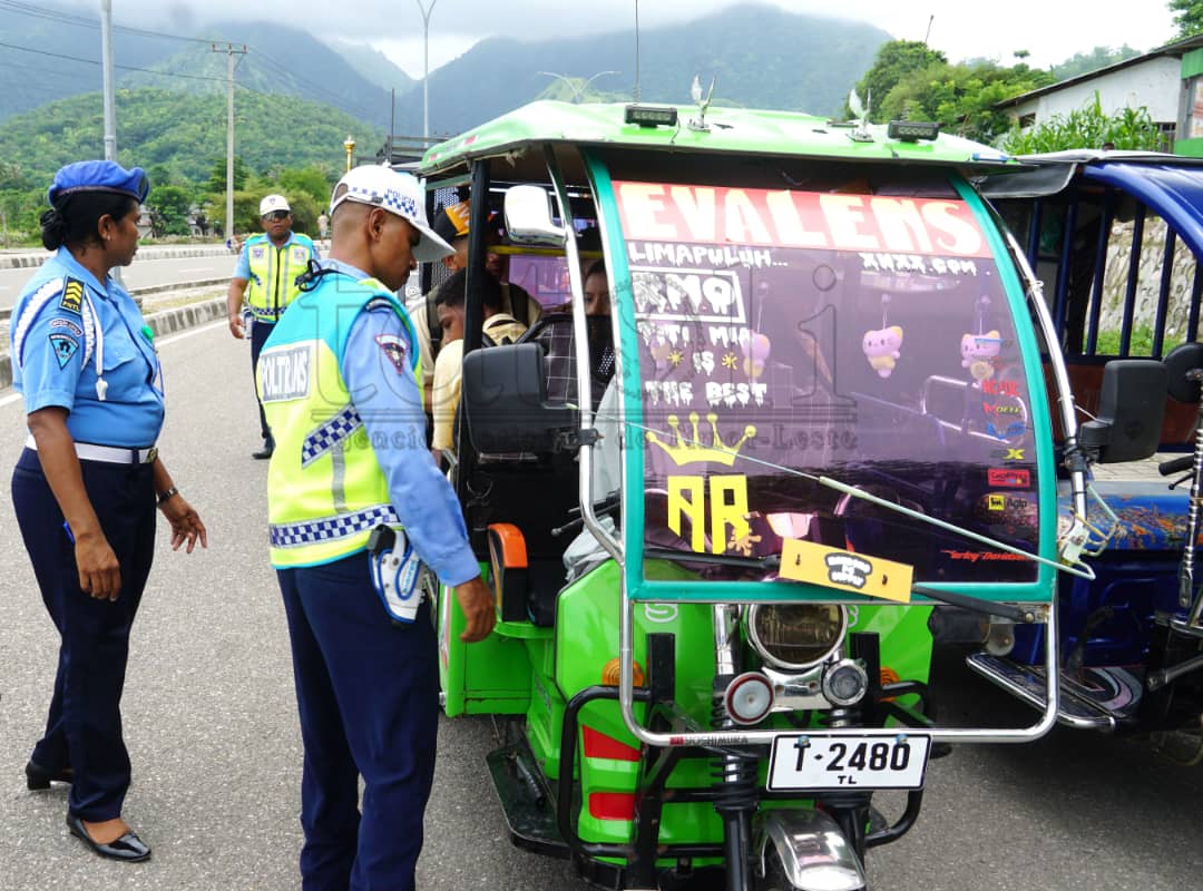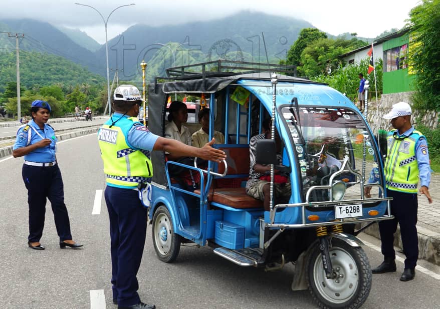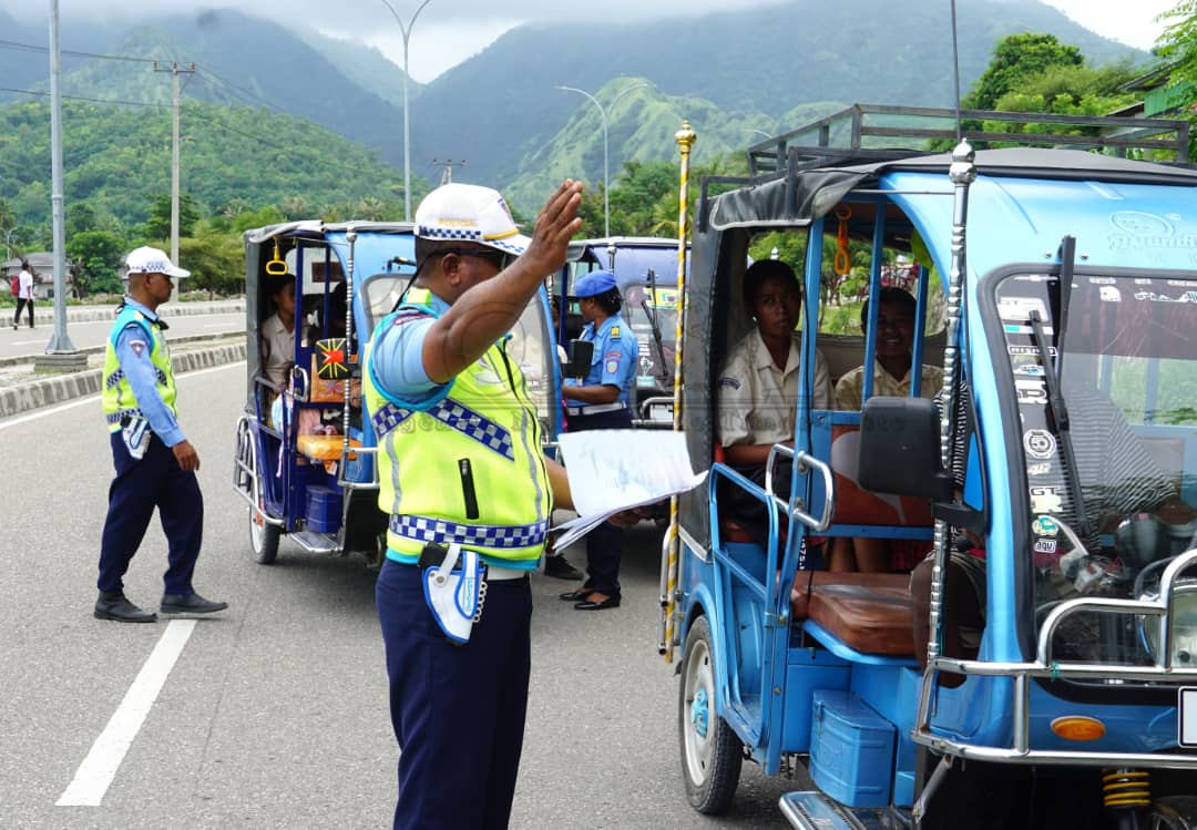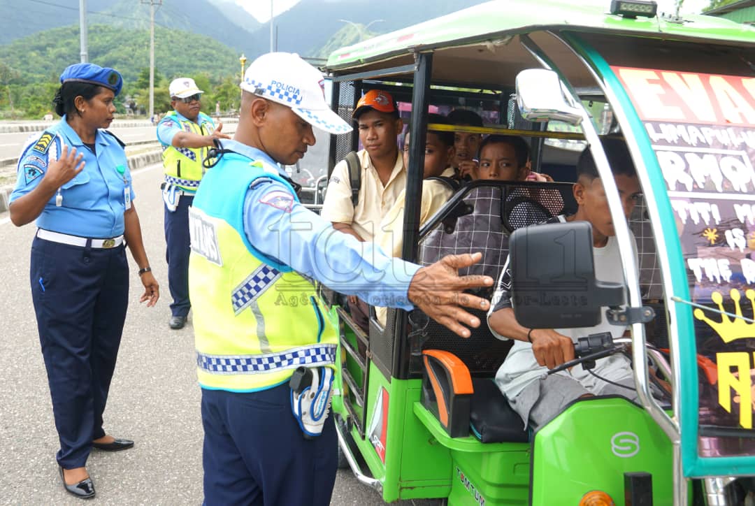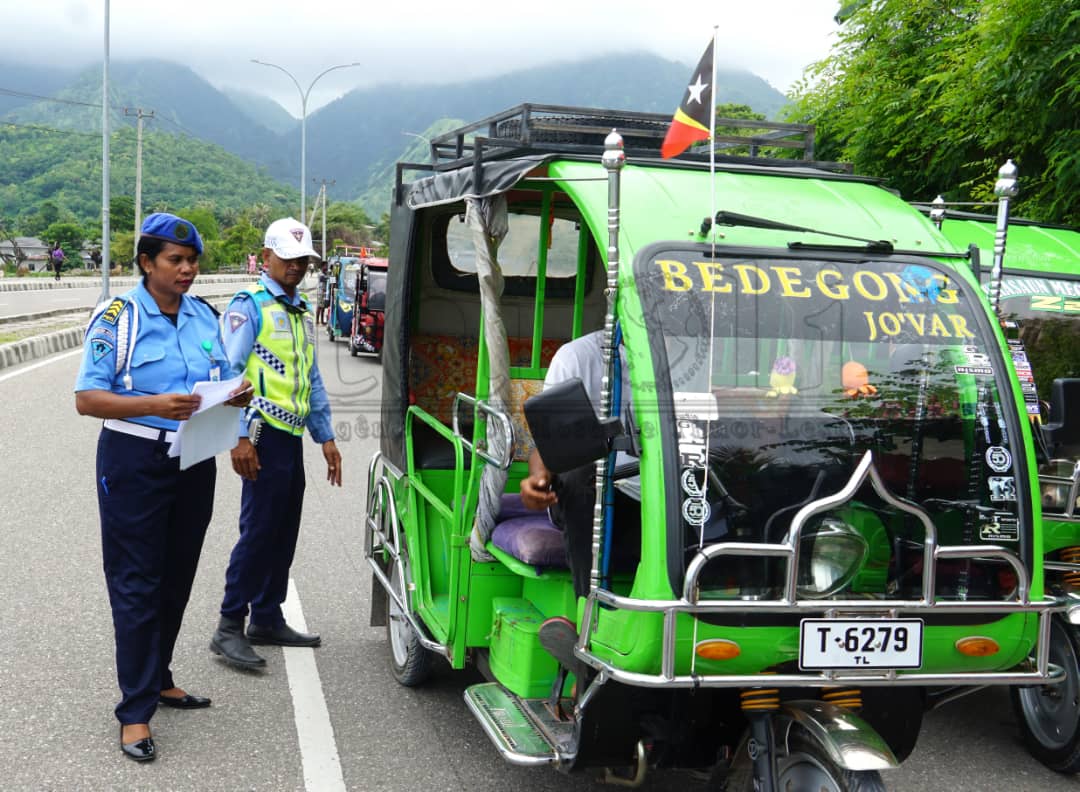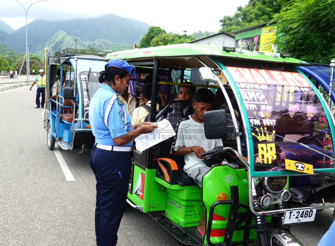 Komandu Polísia Nasionál Timor-Leste RAEOA liuhusi seksaun tránzitu hala’o pasa-revista (auto-stop) ba dokumentu sira ba transporte tum-tum iha diresaun dalan husi Numbei to’o Palaban. Imajen TATOLI/Abílio Elo Nini
