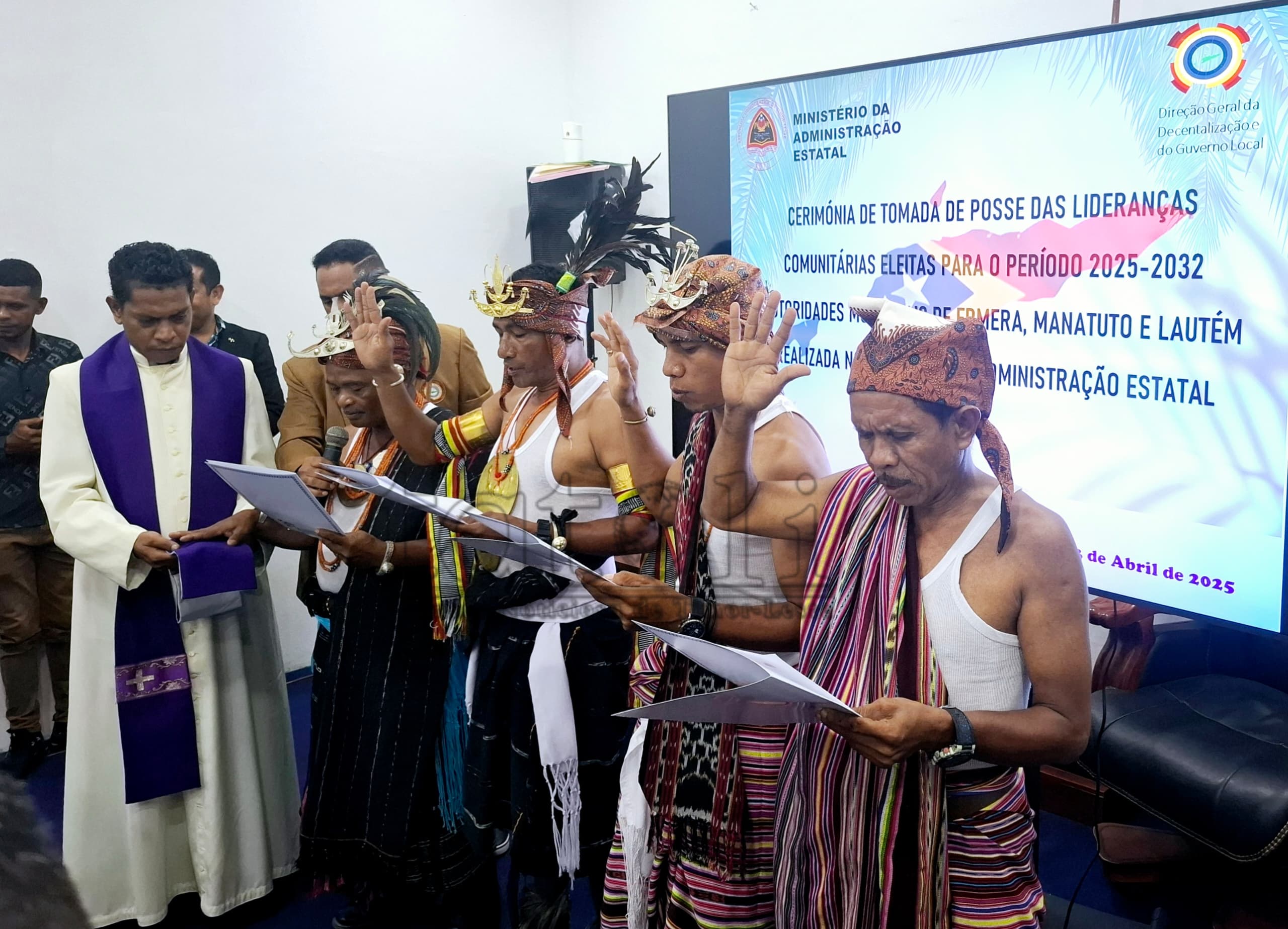 Ministru Administrasaun Estatál, Tomas Cabral, iha seremónia tomada de pose lideransa komunitária eleitu périodu 2025-2032 ba autoridade munisípiu Ermera, Manatutu no Lautein, Kinta (03 abríl 2025). Imajen TATOLI /Antonio Daciparu