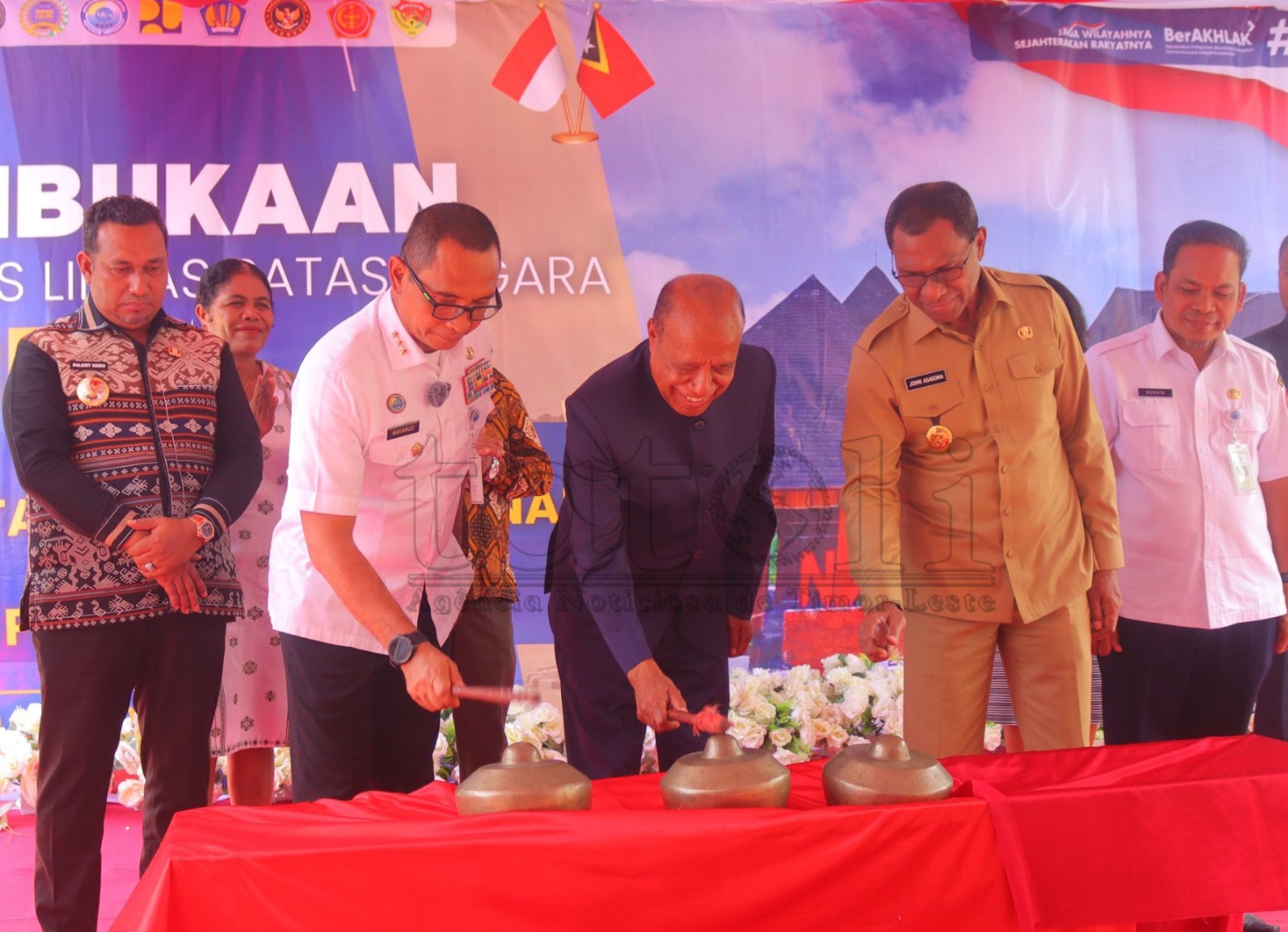 Governu liuhusi Prezidente Autoridade Rejiaun Adminsitrativa Espesiál Oekusi Ambeno (RAEOA), Rogério Tiago Lobato hamutuk ho Vise-Governadór Nusa Tenggara Timur (NTT), Johni Asadoma, kinta ne’e ofisiálmente reativa hikas atendimentu iha fronteira postu Integradu Oésilo ho Pos Linta Batas Negara (PLBN, sigla Indonésia) Napan, ne’ebé paradu kuaze tinan neen hahú iha 2019 to’o ohin loron. Imajen TATOLI/Abílio Elo Nini