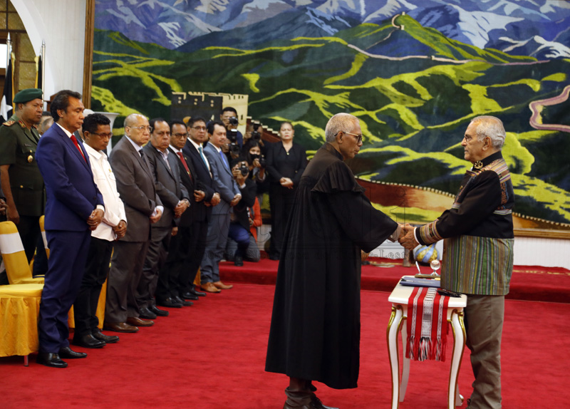 Prezidente Repúblika, José Ramos Horta fó pose ba Prezidente Tribunál Rekursu foun, Juíz Afonso Carmona iha Palásiu Prezidensiál, Bairru-Pité, Dili, tersa (29 abríl 2025). Imajen TATOLI/Antonio Daciparu