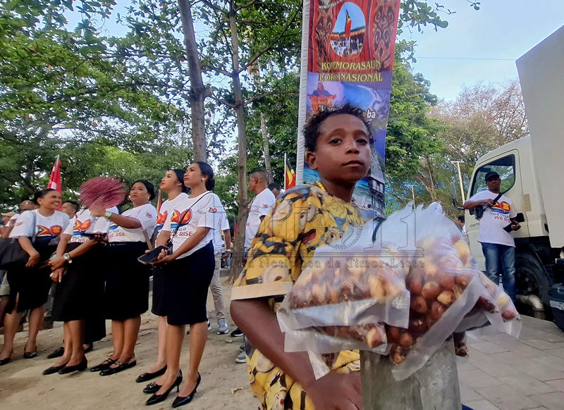 Vendedór faan hela sira-nia sasán durante serimónia komemorasaun adezaun Timor-Leste ba ASEAN ne’ebé selebra hamutuk ho komunidade sira iha Dili 26 Outubru 2025. Foto TATOLI/António Daciparu.
