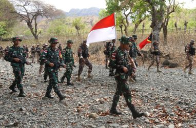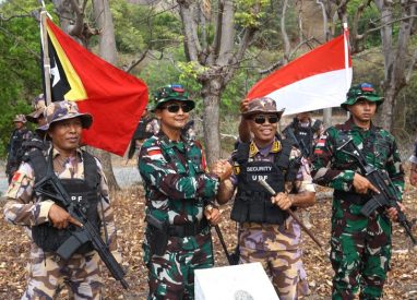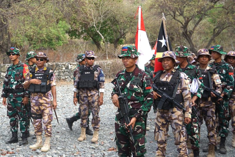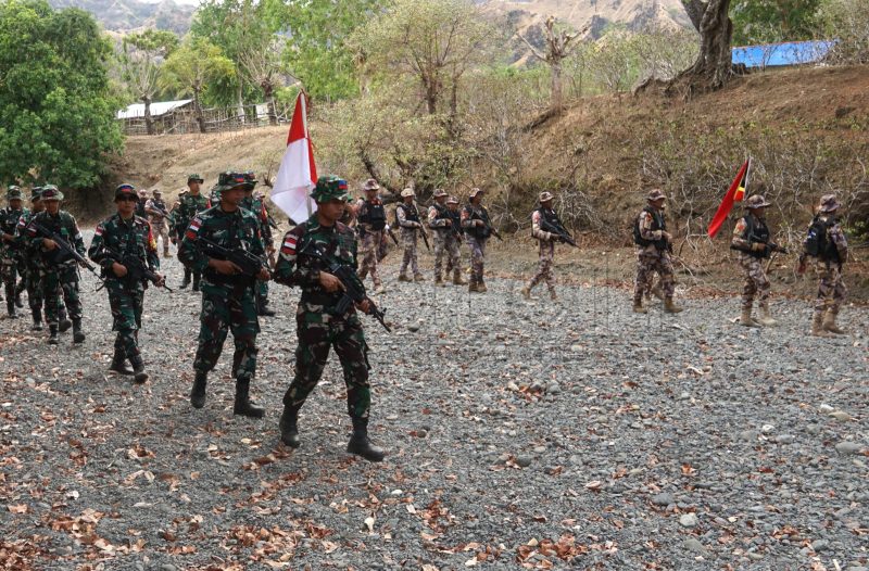 PNTL liuhusi UPF liderada Komandante UPF Superentendente Xefe Polísia, Euclides Belo hamutuk ho TNI-AD, liuhusi Satgas-Pamtas sektor barat liderada Komandante Satgas-Pamtas Letnan Kolonel, Arh Endis Fahrul Rizal, tersa ne’e, hala’o patrullamentu koordenasaun hodi garante seguransa iha liña fronteira Wini-Sakato suku Nípani sub-rejiaun Pante Makasar, RAEOA. Imajen TATOLI/Abílio Elo Nini